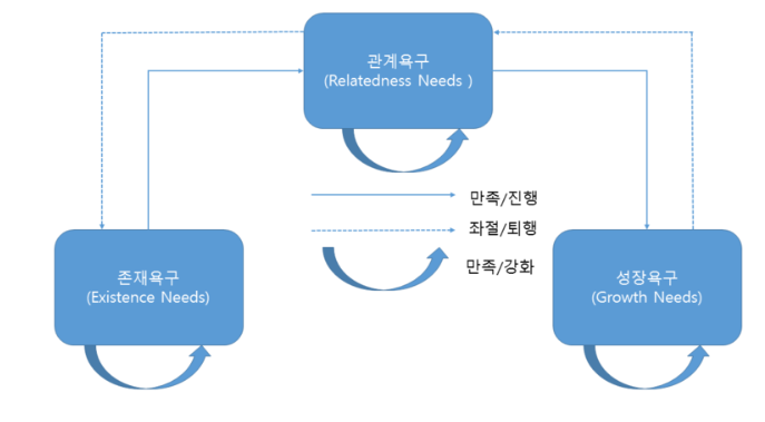 존재 욕구 (Existence Needs): 이 범주는 생리적, 물질적인 욕구를 다룹니다. 음식, 물, 안전한 작업 조건, 급여 등이 여기에 속합니다. 존재욕구는 매슬로의 생리적 욕구와 안전 욕구와 유사한 측면을 가집니다. 관계욕구 (Relatedness Needs): 이 욕구는 사회적, 개인 간 관계를 형성하고 유지하는 욕구를 나타냅니다. 직장에서의 동료, 가족, 친구와의 관계 등이 여기에 속하며, 매슬로의 사회 욕구와 존경 욕구 일부를 포함합니다. 성장 욕구 (Growth Needs): 성장 욕구는 창의적인 공헌, 능력 개발, 자아실현 등과 관련된 욕구를 의미합니다. 이러한 욕구는 개인의 능력을 극대화하고 발전시키는 데 관련이 있으며, 매슬로의 자아실현 욕구와 존경 욕구의 한 부분으로 볼 수 있습니다.
