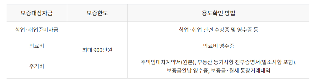 특정용도자금의 구분 및 보증한도는 최대 900만 원까지 가능하며, 증빙 서류가 아래 자금유형에 따라 필요합니다.