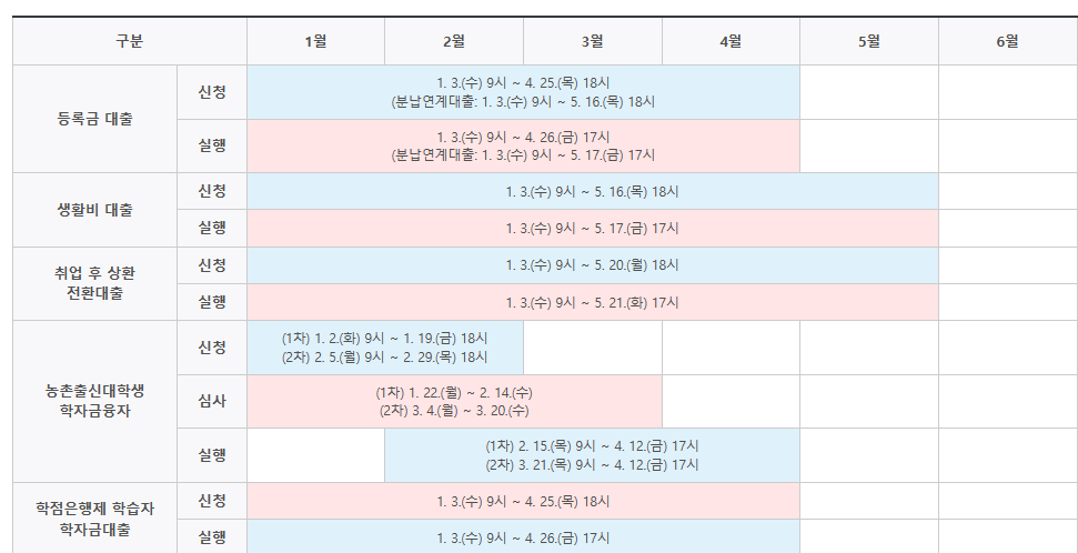 - 등록금 대출: 2024년 1월 3일(수)부터 ~ 4월 25일(목)까지