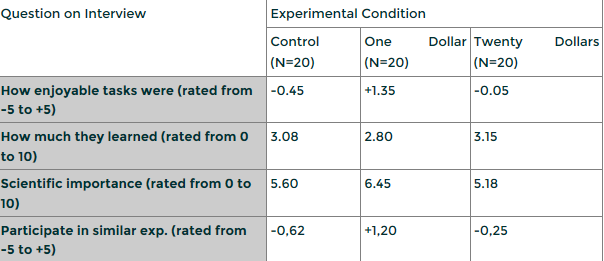 이 실험에서 1달러를 받은 집단은 일에 대해 긍정적으로 평가하고, 자신의 선택을 명확히 인지하며 이로부터 인지부조화를 경험했습니다. 그에 비해 20달러를 받은 집단은 외부정당화를 통해 행동을 정당화하였고, 인지부조화를 상대적으로 적게 경험하게 되었습니다.