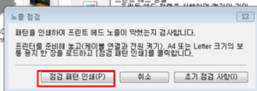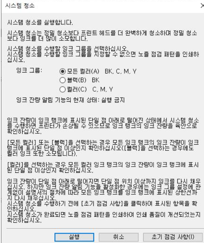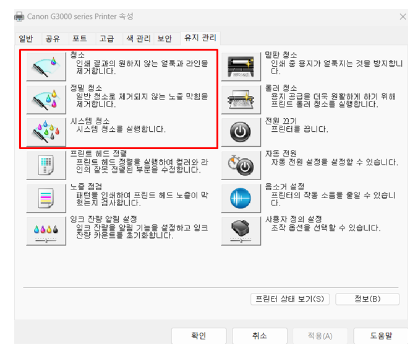 아래 그림과 같은 화면이 나오며, 청소를 클릭 하면 노즐 청소를 시작 합니다.