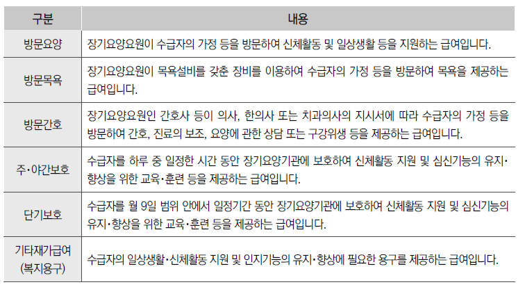 장기요양 등급을 받으면 아래 표와 같은 서비스를 지원받을 수 있습니다.