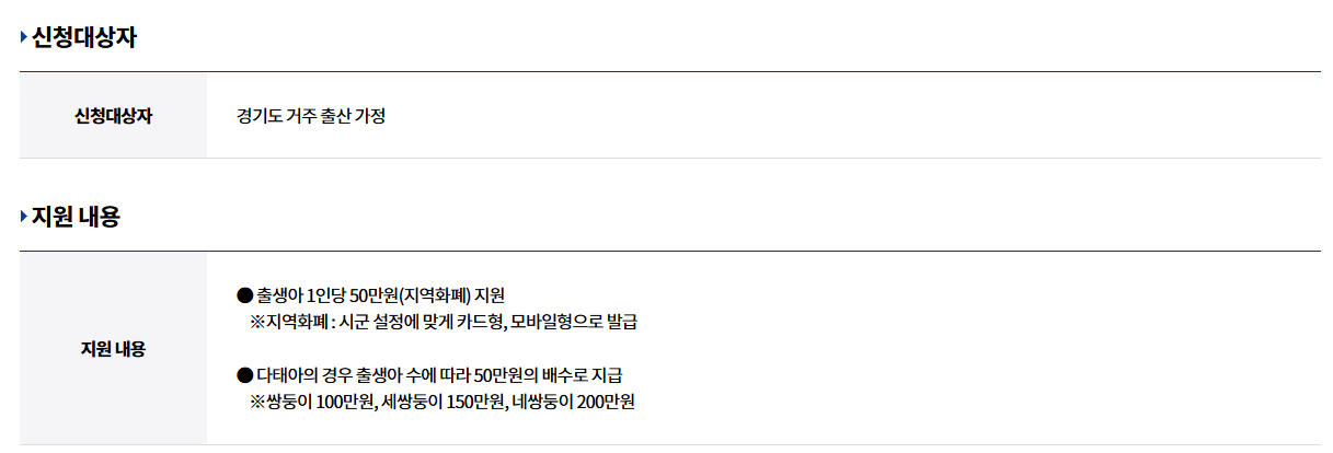 경기도 산후조리원 지원금은 출생아 1인당 50만 원의 지역화폐로 제공됩니다. 다태아의 경우 출생아 수에 따라 50만 원의 배수로 지급되며, 쌍둥이는 100만 원, 세 쌍둥이는 150만 원이 지급됩니다.