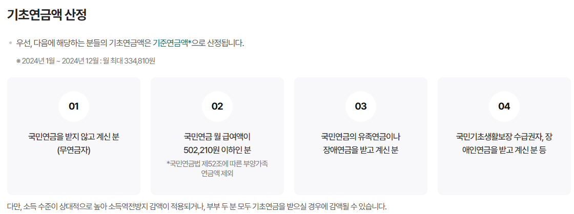 기초노령연금의 지원 금액은 매년 정부 정책에 따라 조정됩니다. 2024년 기준으로, 기초노령연금은 다음과 같이 지급됩니다: