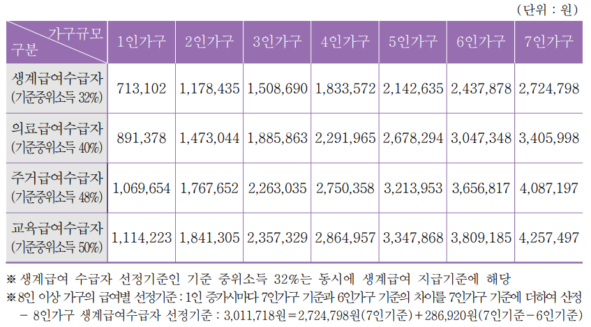 예를 들어, 4인 가구의 중위소득이 540만 원이라면, 생계급여는 약 172만 원 이하, 의료급여는 약 216만 원 이하, 주거급여는 약 259만 원 이하, 교육급여는 약 270만 원 이하일 때 자격이 주어집니다.