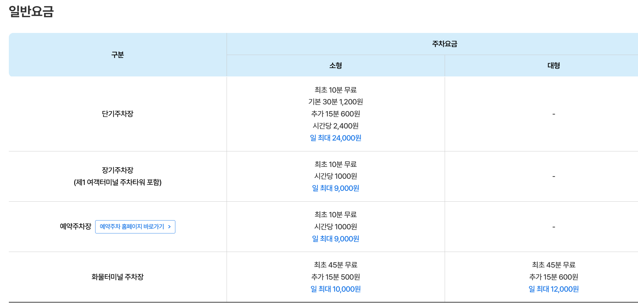 • 장기 주차장 (멀리 위치, 셔틀 이용): 10분 무료, 시간당 1,000원, 일 최대 9,000원